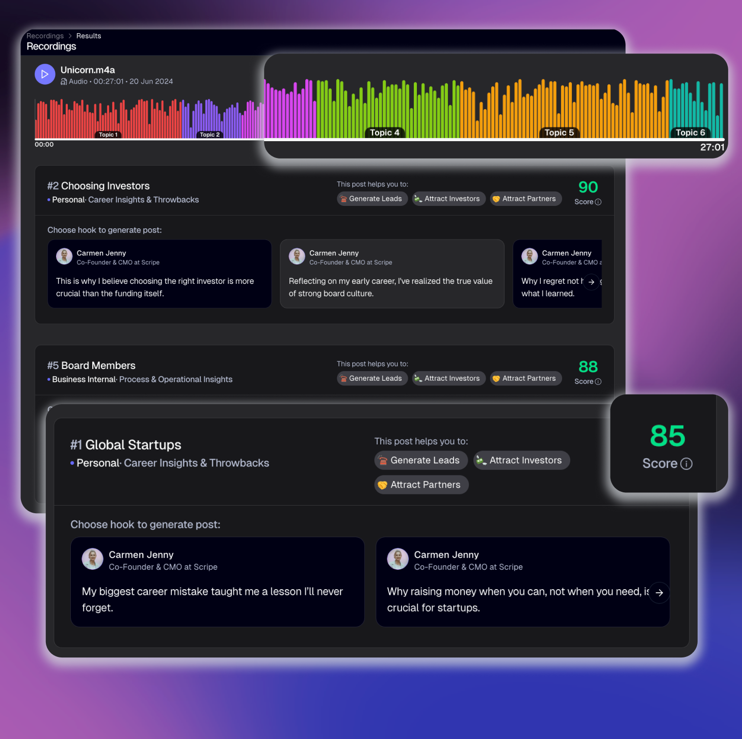 Scripe breaks down your conversation into organized topics, helping you identify the best ideas for your content goals. You’ll have clear, actionable insights to turn raw discussions into polished posts.